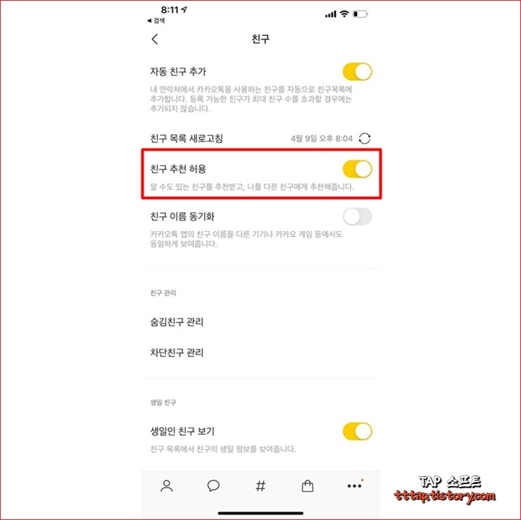카카오톡 추천 친구 추가 내정보 가리기