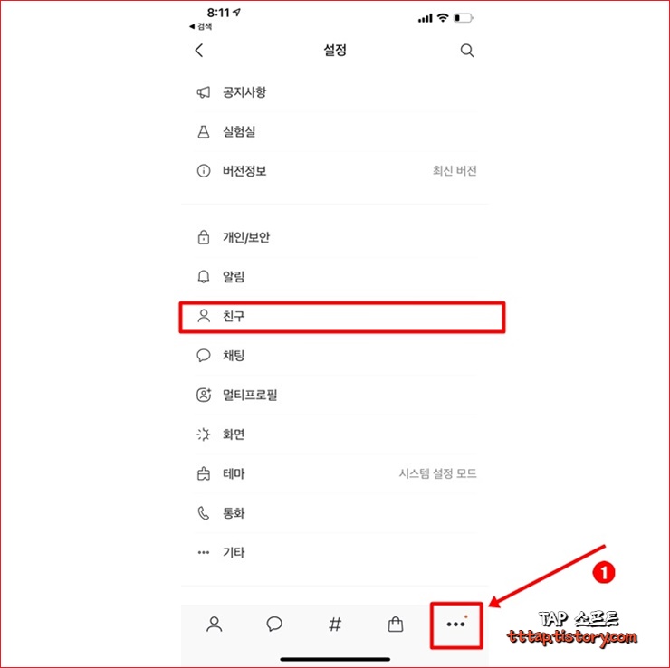 카카오톡 앱을 실행하고 하단 탭 메뉴의 더보기 메뉴를 선택하고 우측 상단의 설정으로 이동합니다. 그리고 친구 메뉴를 선택합니다.