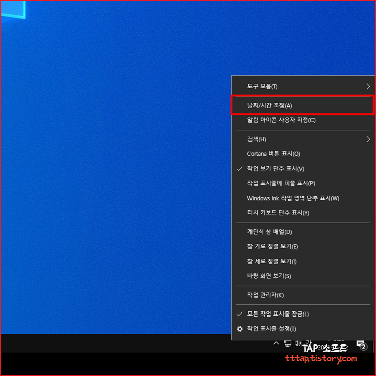 ▼ 1. 우측 하단에 작업표시줄 메뉴중 시계 및 날짜를 [ 오른쪽 버튼 ]을 눌러 메뉴를 노출 시킵니다.
