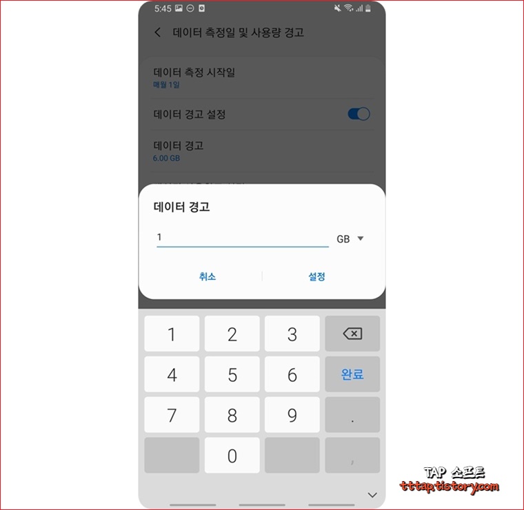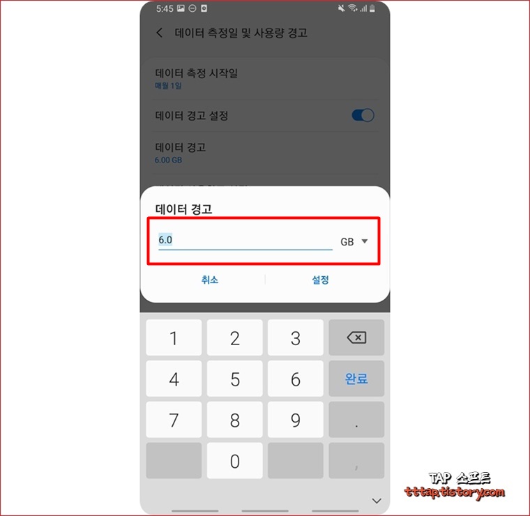 ▼ 6. 기본으로 6기가가 제한되어 있습니다. 데이터 경고 용량을 원하는 값으로 변경합니다. (단위는 GB)