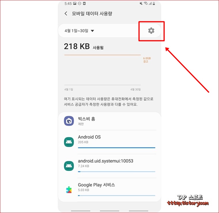 ▼ 4. 모바일 데이터 사용량 메뉴에서 상단 오른쪽 톱니바퀴 모양의 설정 아이콘을 선택합니다.