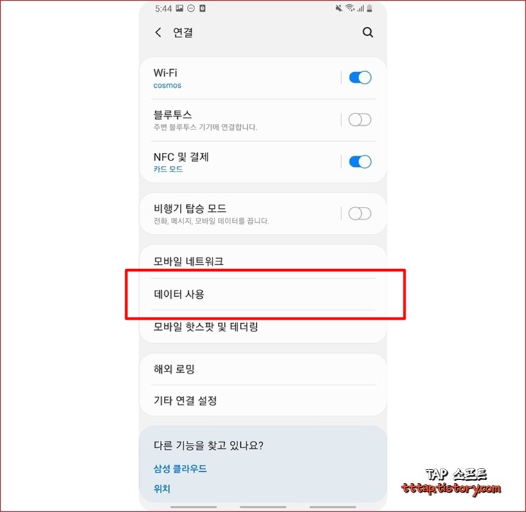 ▼ 2. 연결 메뉴에서 중간쯤에 있는 데이터 사용 메뉴를 선택합니다.