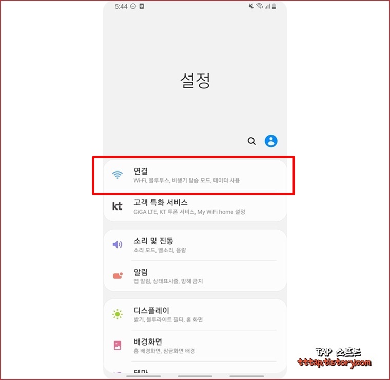 ▼ 1. 설정 앱을 실행시켜서 연결 메뉴를 선택합니다.