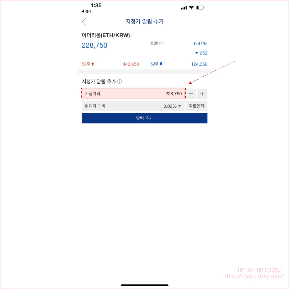 ▼ 3. 지정가 알림 화면에서 지정 가격을 + / - 버튼을 이용해 직접 입력을 하거나 현재가 대비 퍼센트로 가격을 설정 할 수 있습니다.