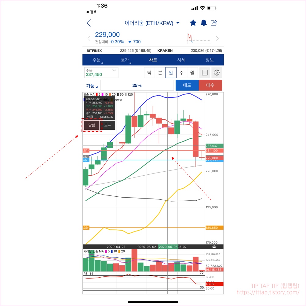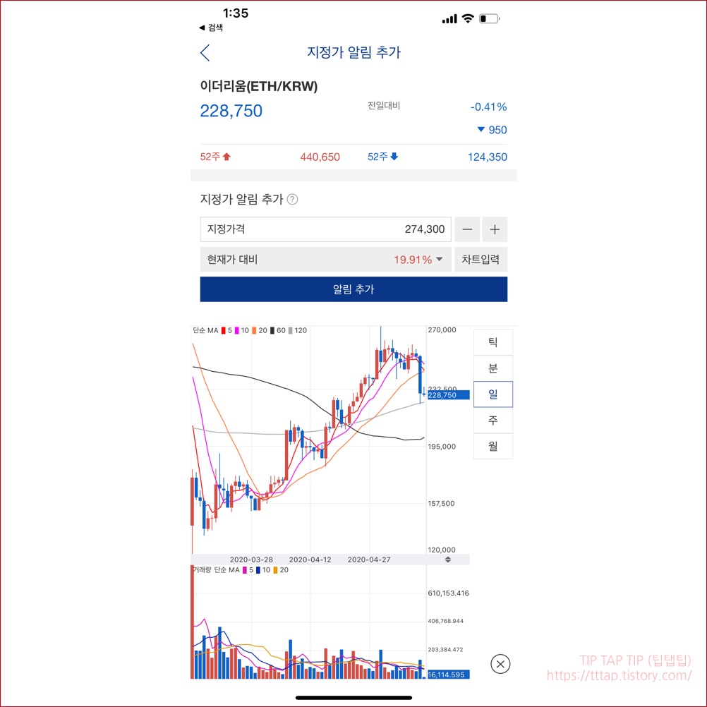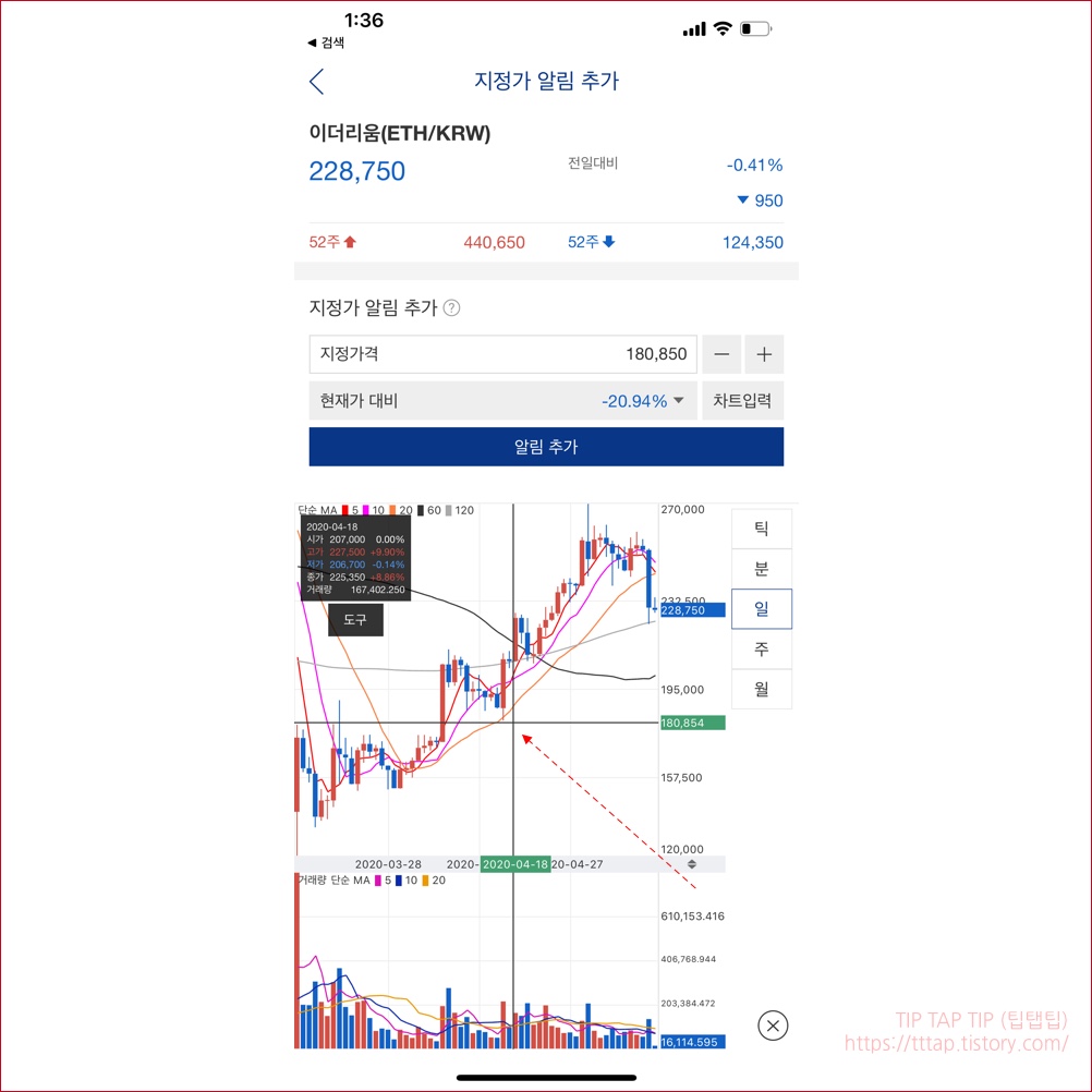 ▼ 6. 이러한 기능을 동일하게 챠트 화면에서도 가능합니다. 차트 화면에서 위치를 터치해서 지정하면 작은 메뉴가 나오는데요. 이때 알림 버튼을 누르면 지정가 알림 화면으로 이동하게 되며 나머지 알림 추가 동작은 위에서 본 과정과 동일합니다.