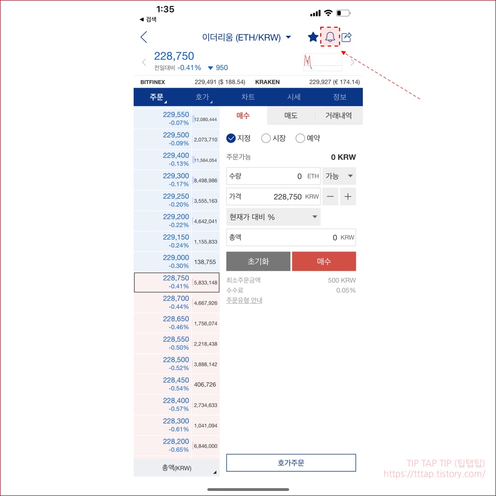 ▼ 1. 일단 거래소에서 푸시 알림을 받고 싶은 코인을 선택합니다.