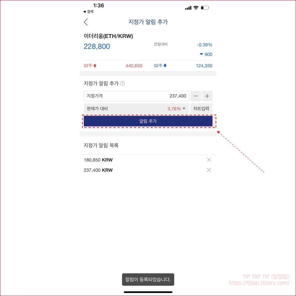 ▼ 7. 마지막으로 알림 추가 버튼을 누르면 지정가 알림 목록에 등록되는 것을 보실 수 있습니다.