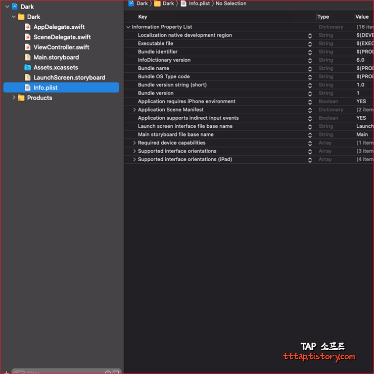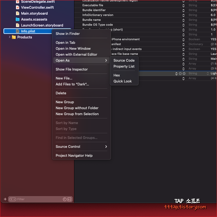 ▼ 7. 아까 전에 봤던 소스코드와 동일하게 UIUserInterfaceStyle로 변경된 것을 확인할 수 있습니다. 이처럼 Xcode는 사용자가 보기 편한 Key 타입 방식과 실제 사용되는 Raw Key의 값을 구분해서 사용합니다.