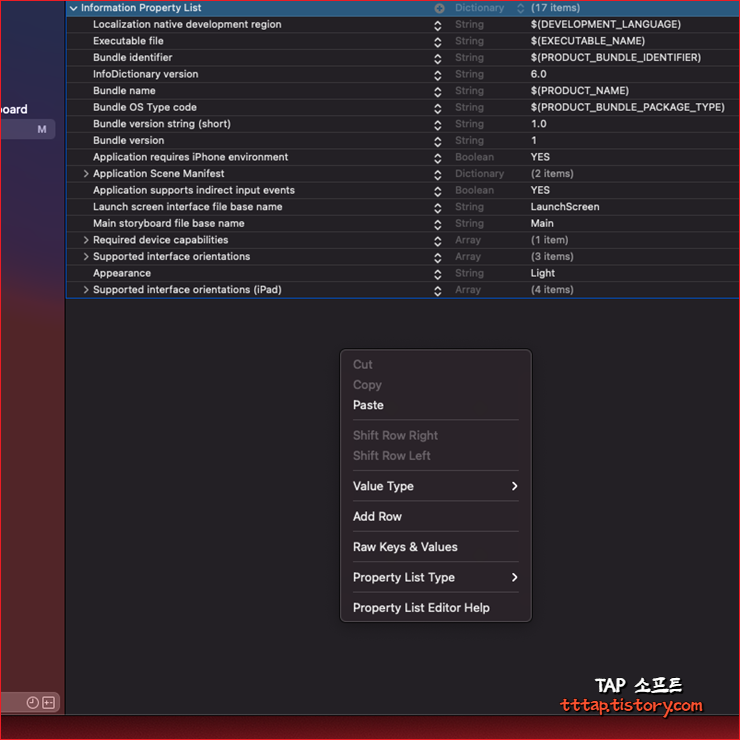 ▼ 1. 프로젝트에서 info.plist 파일을 선택합니다.