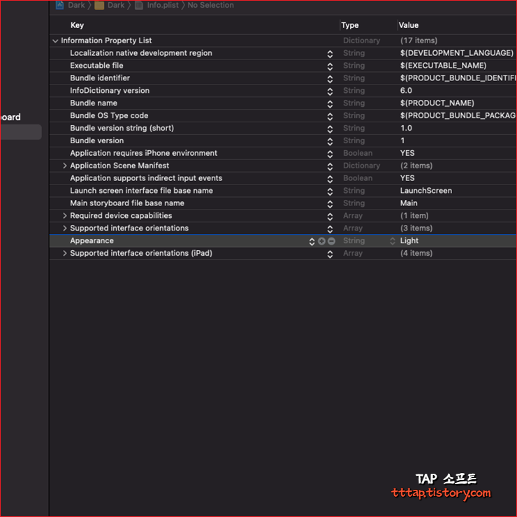 ▼ 5. 해당 키가 UIUserInterfaceStyle 로 잘 입력된 것을 확인할 수 있습니다. 키의 스트링 값은 Light로 설정됩니다.
