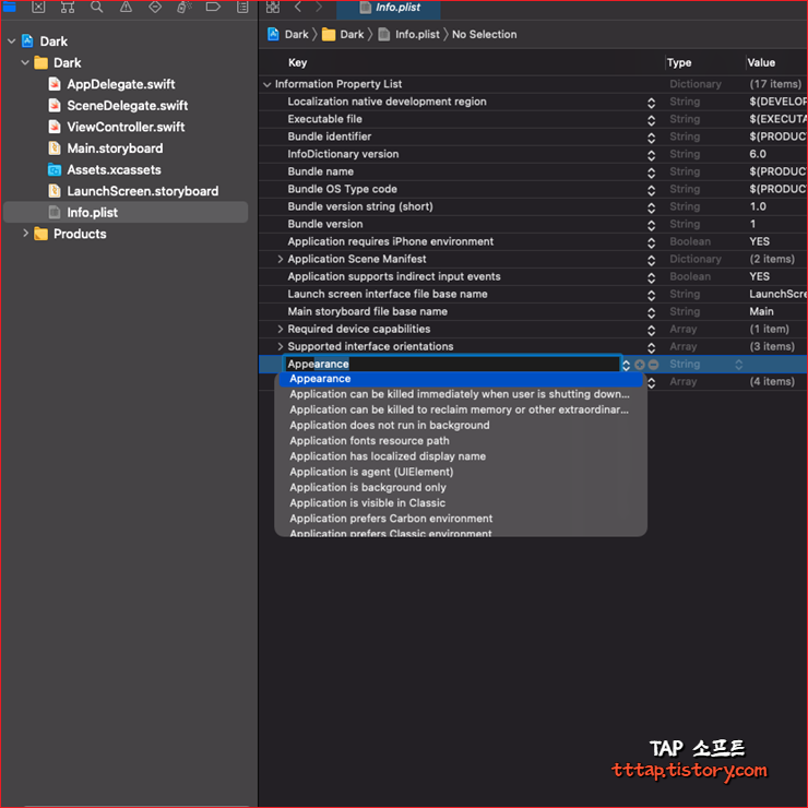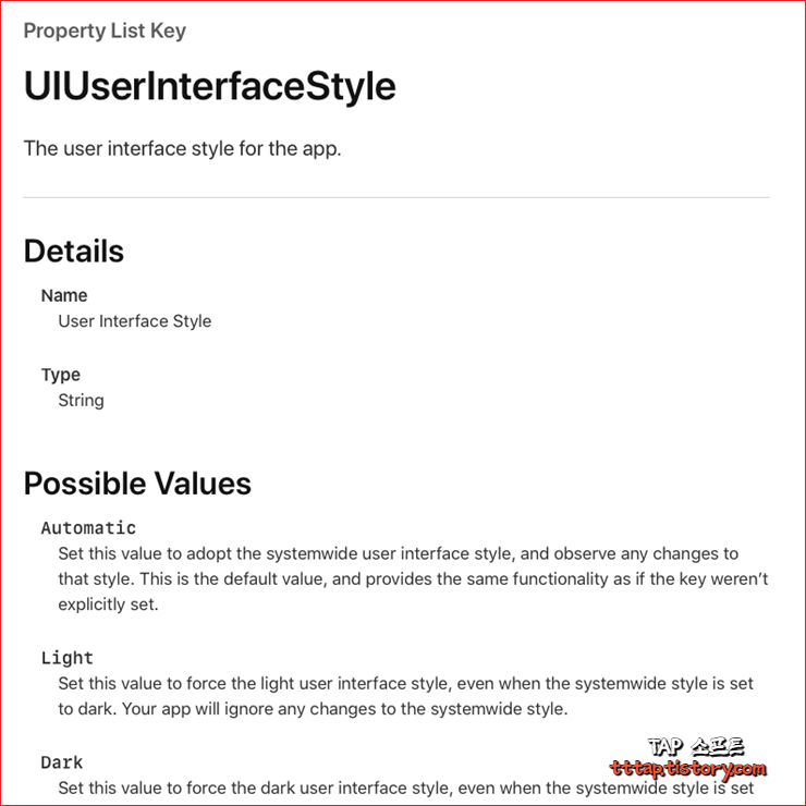 또한 Property List Key (Info.plist) 설정에 도 다음과 같이 해당 키가 존재합니다. 문자열이며 위의 enum 값과 비슷하게 자동, 라이트 모드, 다크 모드 이런 식으로 구성되어 있습니다.