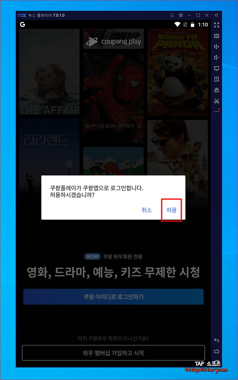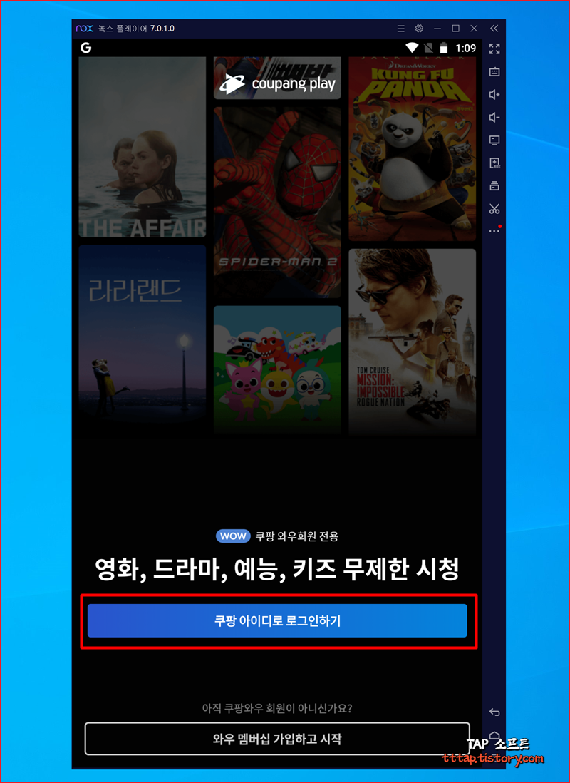 ▼ 1. 쿠팡 플레이에 녹스 플레이어를 통해 로그인한 모습입니다. 이제 영화나 드라마, 예능을 무제한으로 컴퓨터로 볼 수 있겠네요.