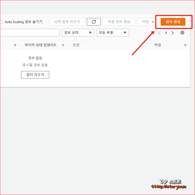 ▼ 4. 경보 메뉴를 누르고 진입하면 경보 생성 메뉴를 선택해서 새로운 경보를 만듭니다.