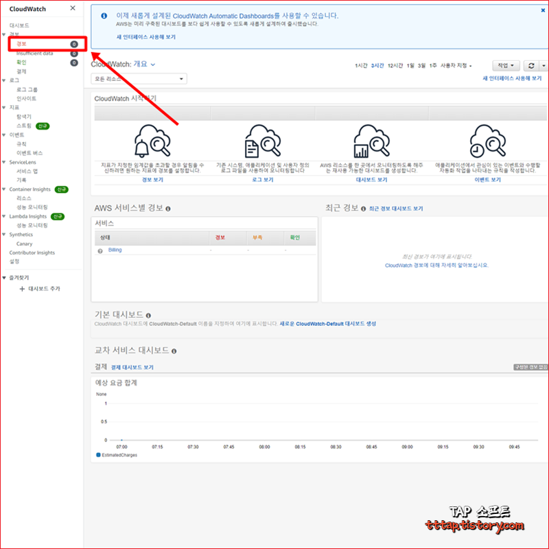 아마존 AWS, 결제 비용 클라우드 와치 경보 알람 설정