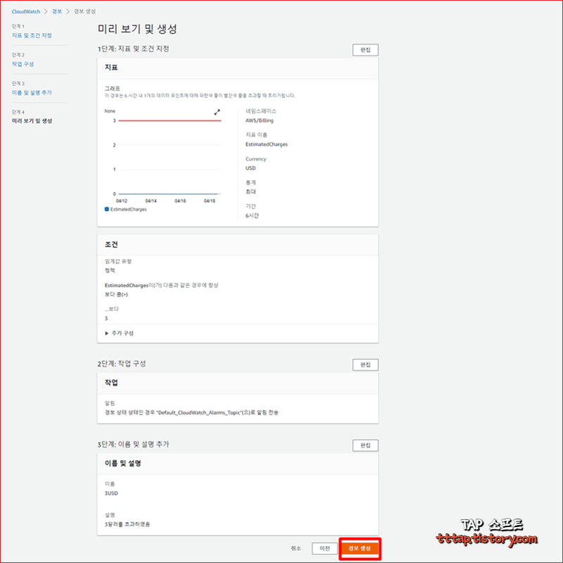 ▼ 11. 미리 보기 및 생성 화면에서 지금까지 만든 알림에 대한 상세정보를 볼 수 있습니다. 편집할 내용이 없으면 경보 생성 버튼을 눌러 경보를 생성합니다.