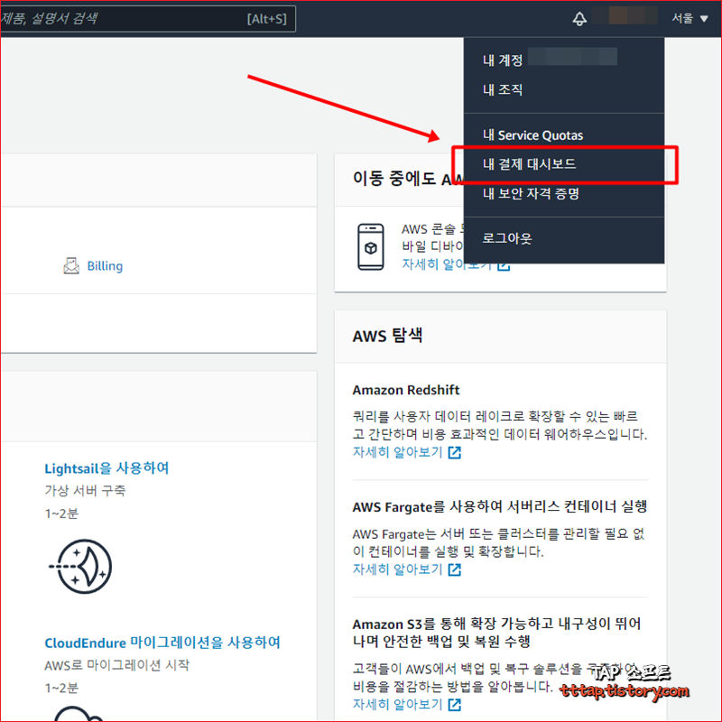 ▼ 1. 우측 상단 사용자 이름을 누르면 서브 메뉴가 나오는데 그중 내 결제 대시보드 메뉴를 선택합니다.