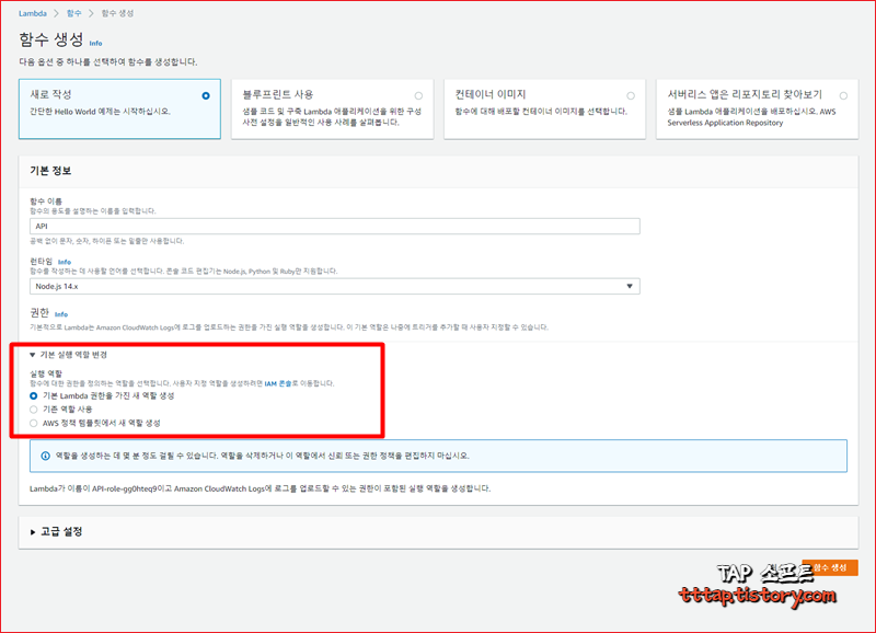 ▼ 4. 기본 실행 역할을 변경해줍니다. 기본 Lambda 권한을 가진 새 역할을 생성에 체크합니다. 우측 하단의 함수 생성 버튼을 눌러서 함수 생성을 완료합니다.