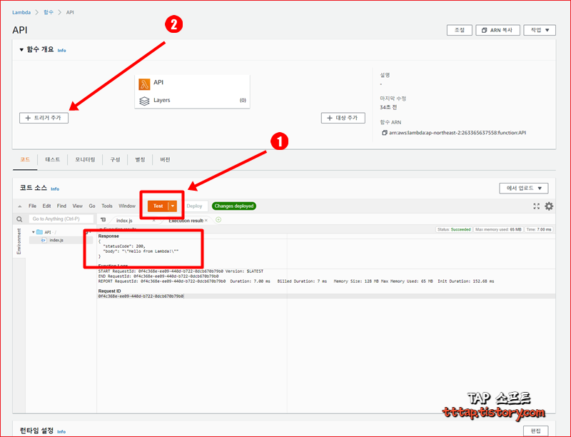 ▼ 8. 이벤트가 만들어졌다면 테스트 버튼(1)을 눌러 테스트 합니다. 그럼 결과 값이 노출되는 것을 확인할 수 있습니다. 이제 실제로 웹에서 요청을 해보기 위해서 트리거 추가(2) 버튼을 눌러 트리거를 추가합니다.