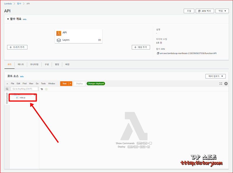 ▼ 5. 함수 생성이 끝나면 index.js 파일과 함께 Node.js 환경이 구성됩니다. 현재는 메인 파일 하나만 등록되어 있고 에디터에서 파일을 추가 생성할 수 있습니다. index.js 파일을 선택해보겠습니다.