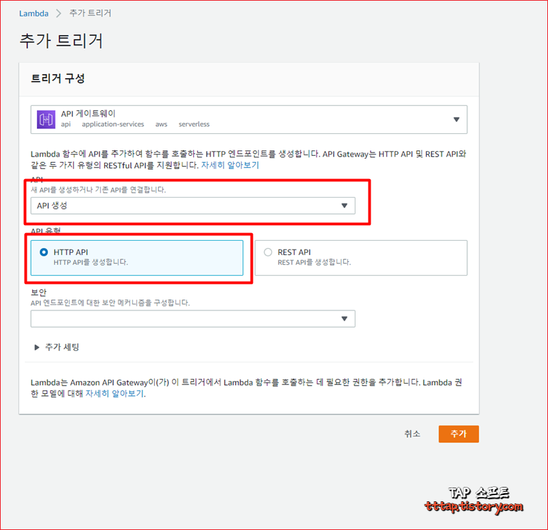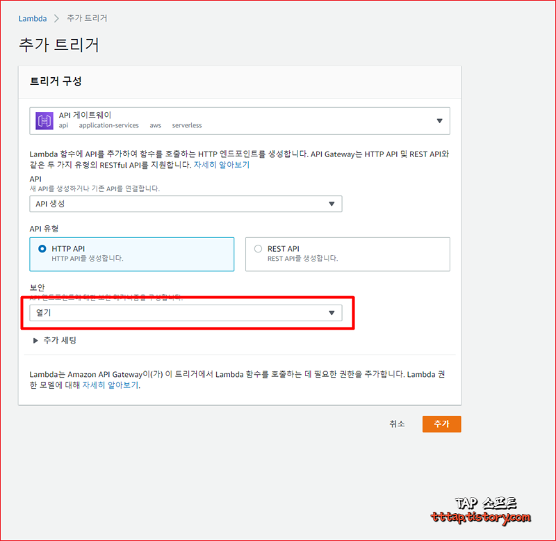▼ 11. 아무나 접근할 수 있도록 보안을 열기로 변경합니다. 추가 버튼을 눌러서 트리거 생성을 완료합니다.