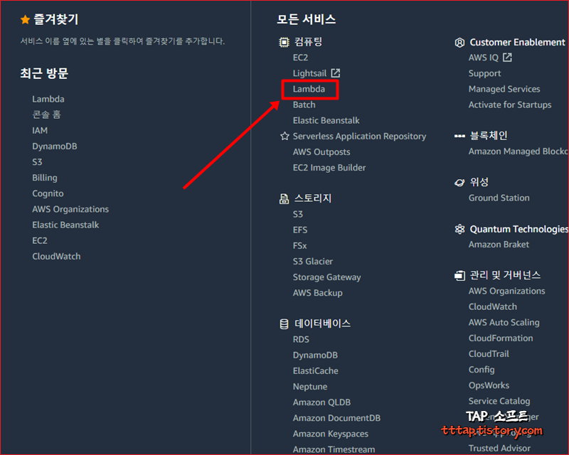 ▼ 1. 모든 서비스 > 컴퓨팅 에서 Lambda 서비스를 선택합니다.