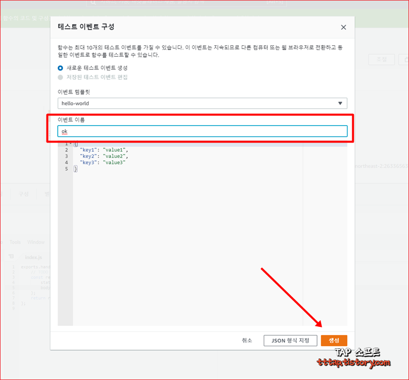 ▼ 7. 테스트 이벤트는 처음 람다에서 들어오는 핸들러에 들어갈 event 인자의 JSON 값입니다. 해당 값을 사용하지는 않을 것이기 때문에 그냥 이벤트만 작성하고 생성을 눌러줍니다.
