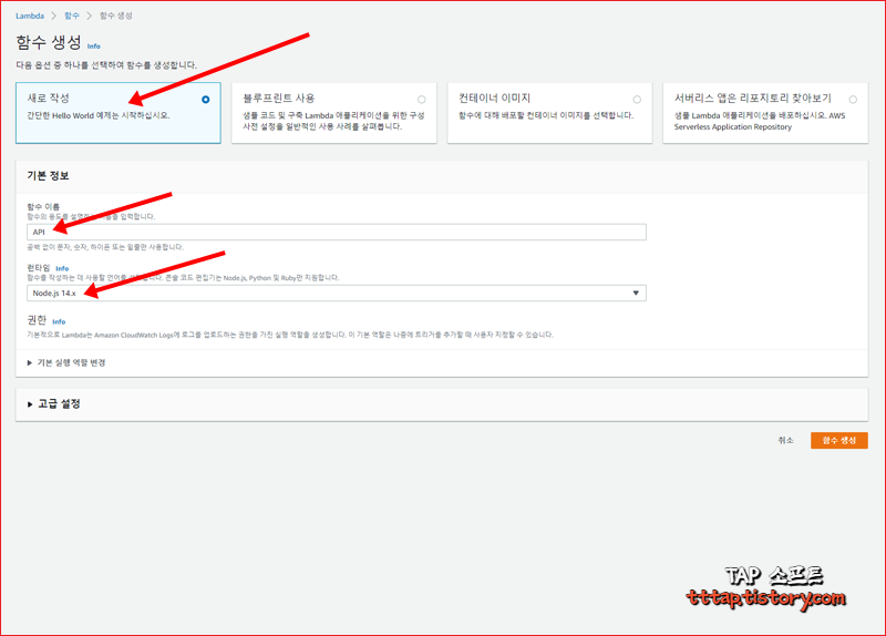 ▼ 3. 함수 생성 페이지에서 새로 작성 메뉴를 누르고 함수 이름, 런타임을 선택합니다. 함수 이름은 API로 하고 런타임은 Node.js 로 해주겠습니다.