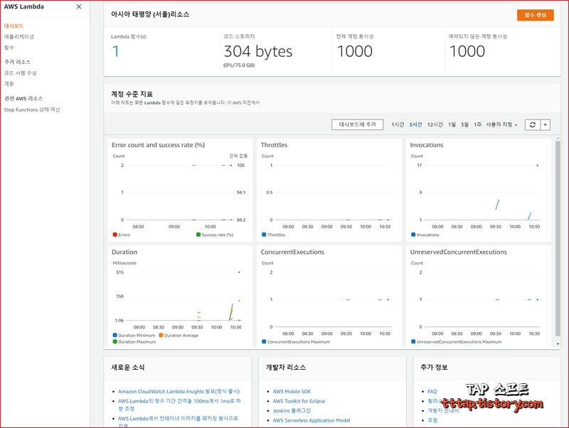 ▼ 15. AWS 람다 대시보드에서 보면 현재 만들어진 함수의 개수와 코드의 용량 및 기타 상태를 그래프로 볼 수 있습니다.