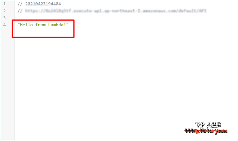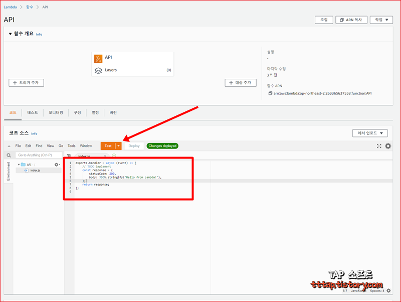 ▼ 6. 다음 박스에 보면 간단한 응답에 대한 코드가 자동으로 쓰여 있습니다. 그대로 테스트 버튼을 눌러 테스트 이벤트를 만들어보겠습니다.