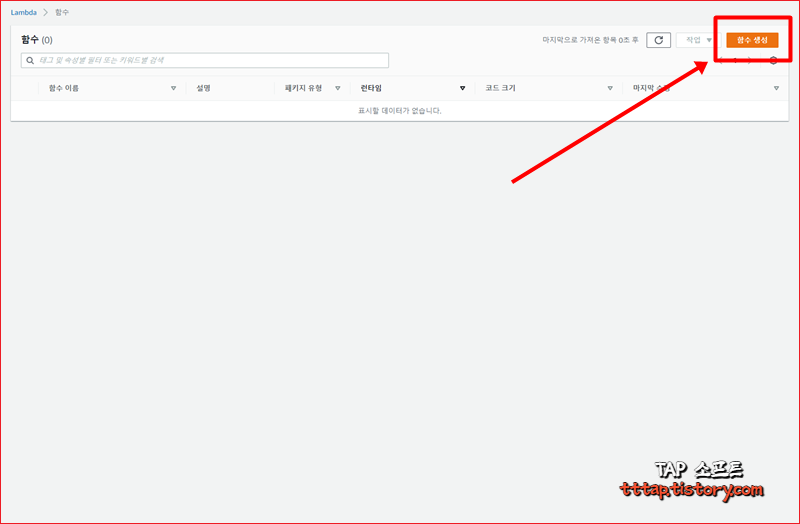 ▼ 2. 람다 > 함수 페이지에서 함수 생성을 선택하고 새로운 함수를 생성합니다.