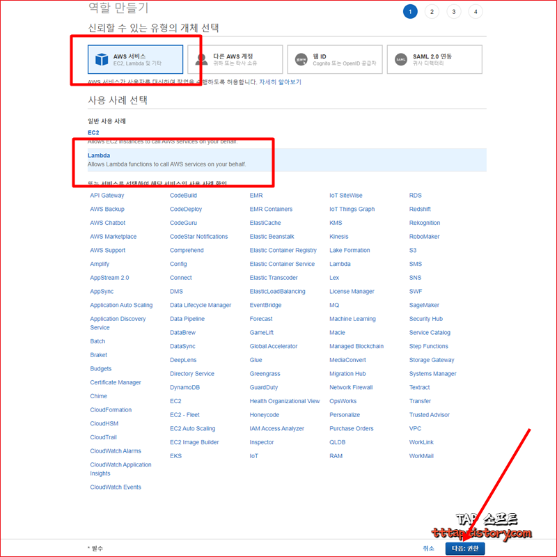 ▼ 11. AWS 서비스를 선택학 Lambda를 선택해줍니다. 우측 하단 버튼을 눌러 권한으로 이동합니다.