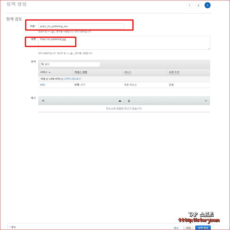 ▼ 9. 정책 생성에서 이름과 설명을 입력합니다. 이름과 설명은 자신이 원하는 걸 입력해도 상관없습니다.
