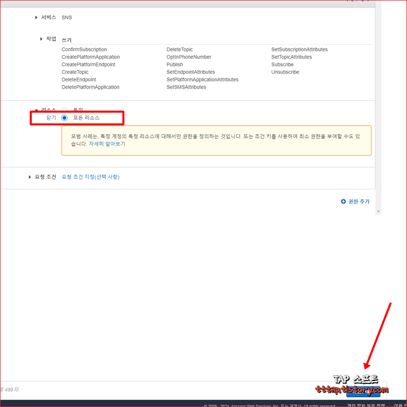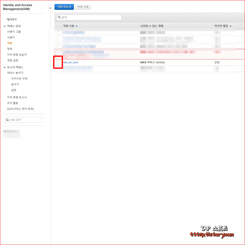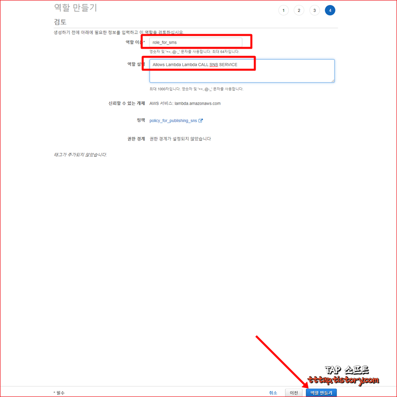지금까지 AWS 람다 서비스를 이용해 SNS 문자를 보내기 위해서 아마존 IAM에서 간단히 정책과 역할을 설정해봤습니다. 상당히 길고 내용이 많은데요. 만드는 과정은 그렇게 어렵지 않습니다. 이제 다음 포스팅에서 실제 람다 서비스를 만들어 SNS를 연동하는 것 까지 진행해보겠습니다.