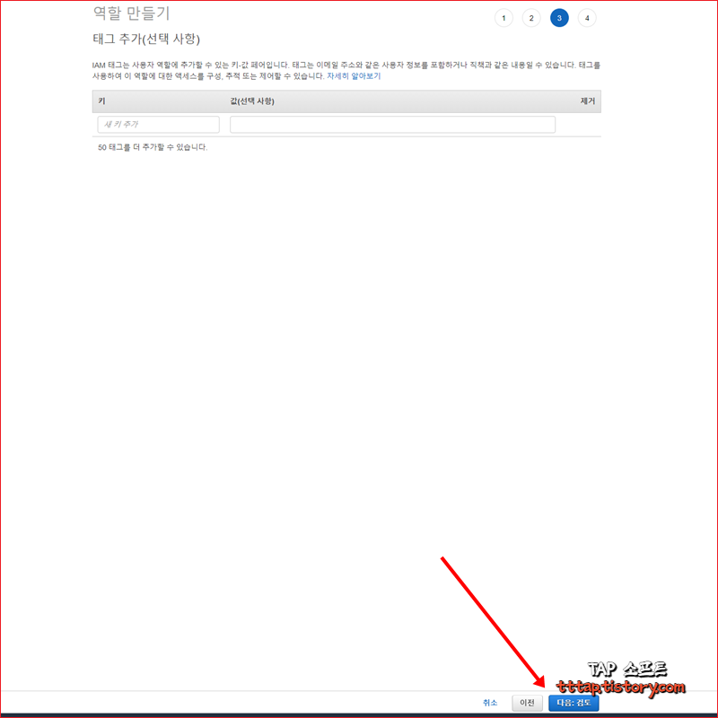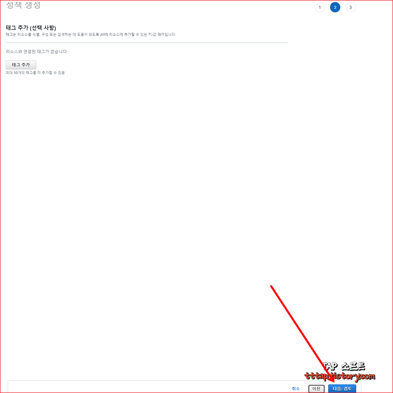 ▼ 8. 태그 페이지는 무시하고 우측 하단의 검토 버튼을 눌러줍니다.