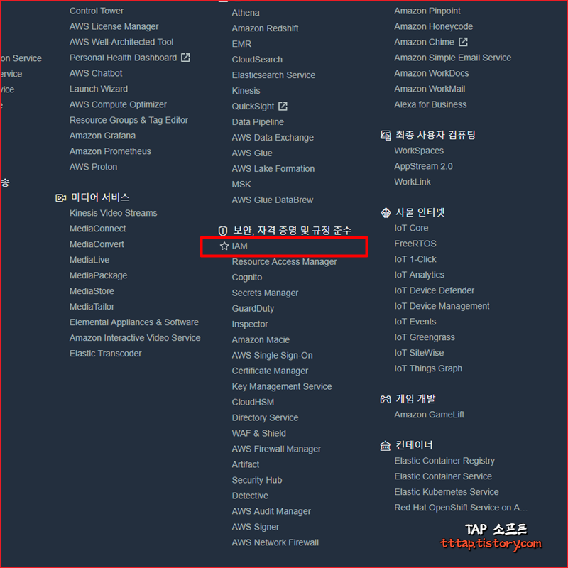 ▼ 1. 정책과 역할을 생성하기 위해서 IAM 서비스에 들어갑니다.