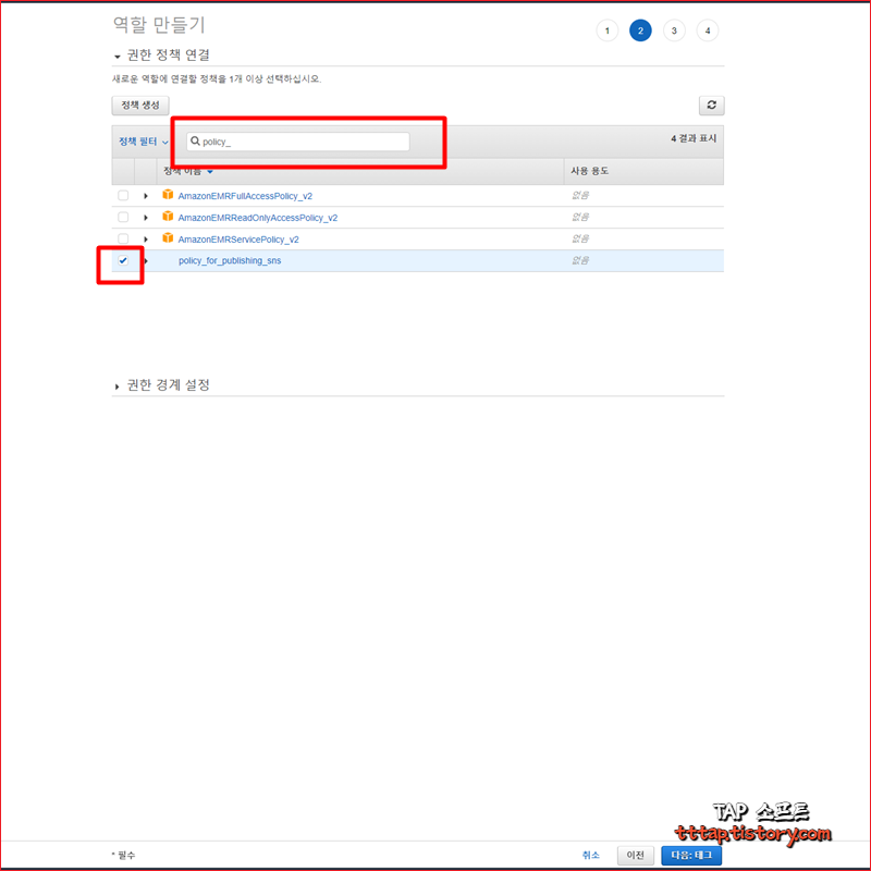 ▼ 12. 권한 정책 연결에서 아까 만들었던 정책을 검색하고 선택해줍니다. 커스텀으로 만든 권한이라 아이콘이 없습니다.