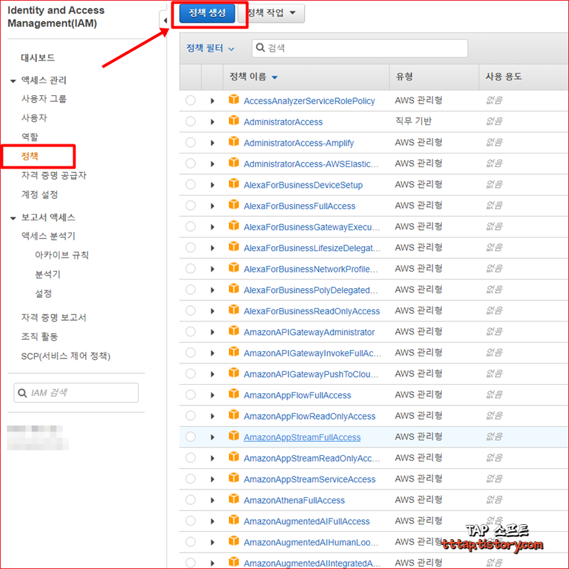 ▼ 2. 좌측 메뉴에서 정책을 선택하고 정책 생성 버튼을 눌러서 정책을 생성합니다.