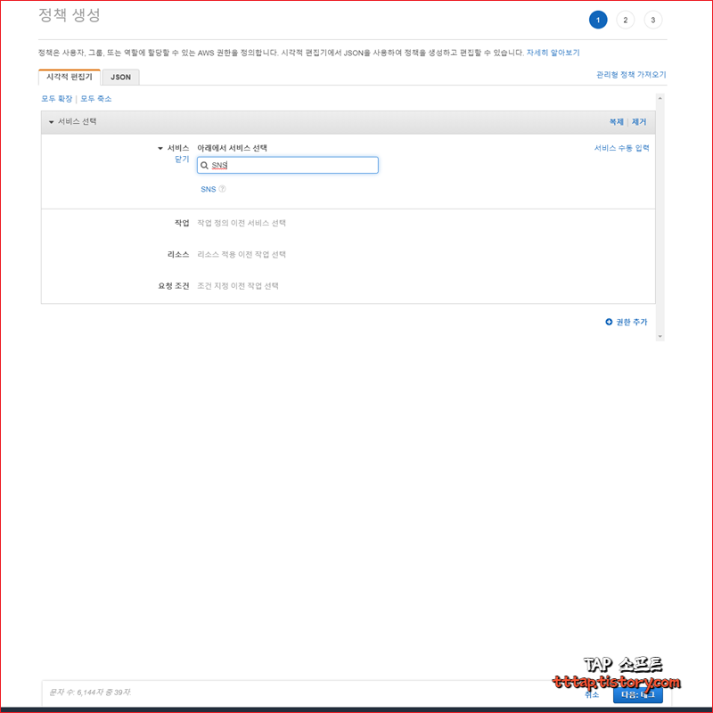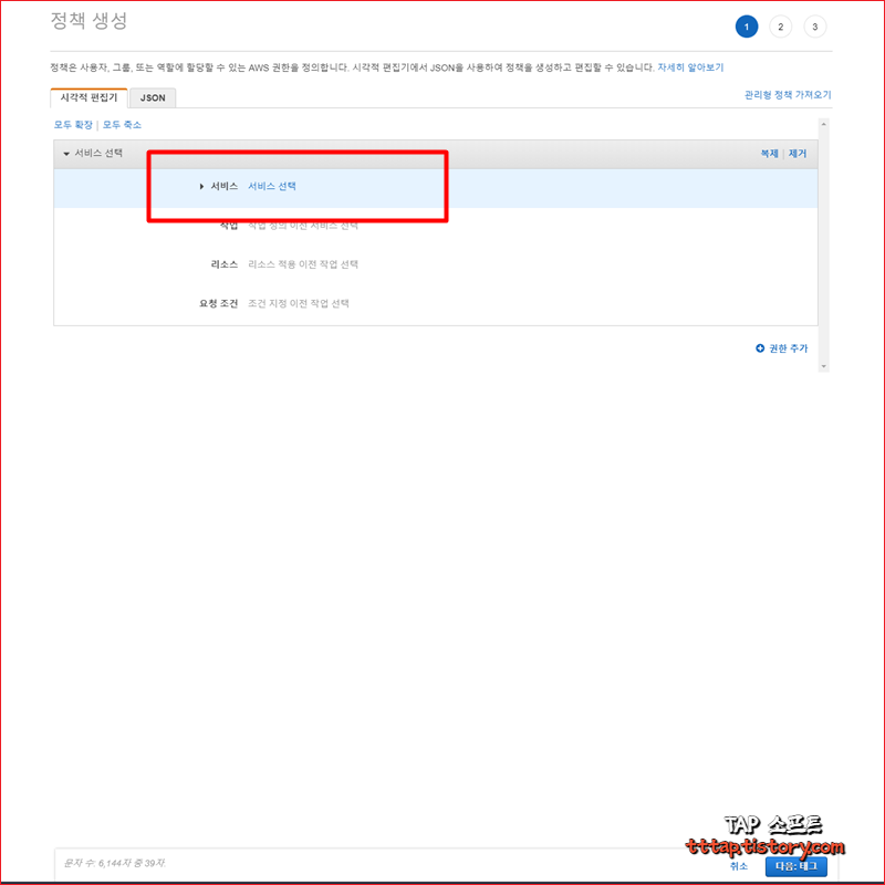 ▼ 3. 정책 생성 페이지에서 시각적 편집기 탭을 선택하고 서비스 선택을 눌러줍니다. 그리고 서비스 선택 링크를 눌려 메뉴를 펼쳐줍니다.