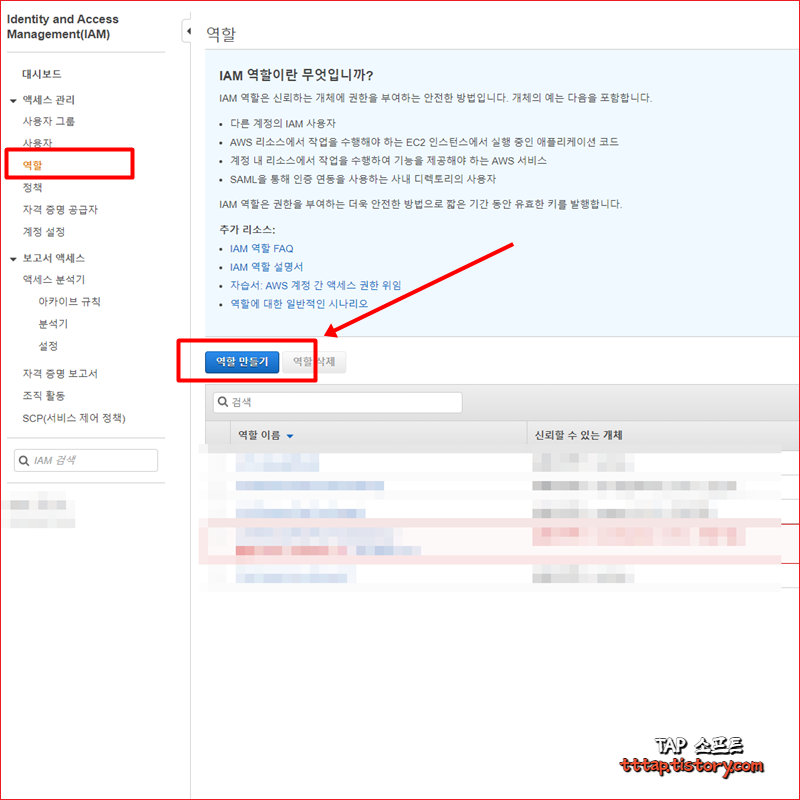 ▼ 10. 다시 IAM 설정으로 돌아가서 이번에는 정책 메뉴 바로 위에 있는 역할 버튼을 누르고 오른쪽 창에서 역할 만들기 버튼을 눌러줍니다.