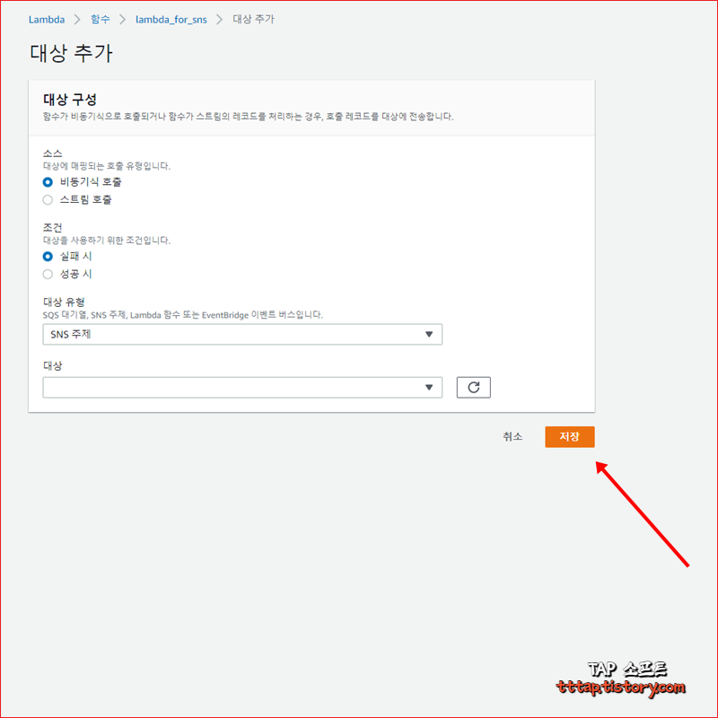 ▼ 5. 위의 화면의 + 대상 추가버튼을 눌러서 Amazon SNS 대상을 추가합니다. 검색에서 Amazon SNS를 선택하고 저장을 눌러줍니다.