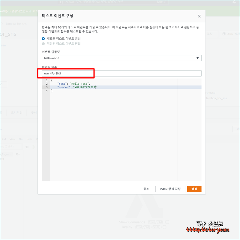 ▼ 6. 이번에는 테스트 이벤트를 작성합니다. 이벤트 이름을 작성하고 인자로 전달할 두개의 값을 JSON으로 생성합니다. 핸드폰 번호를 입력할 때 국가 번호를 추가해서 다음과 같은 형식으로 작성합니다. 82는 국가 코드입니다. +821077772222 (전화번호 맨 앞의 0을 제거)