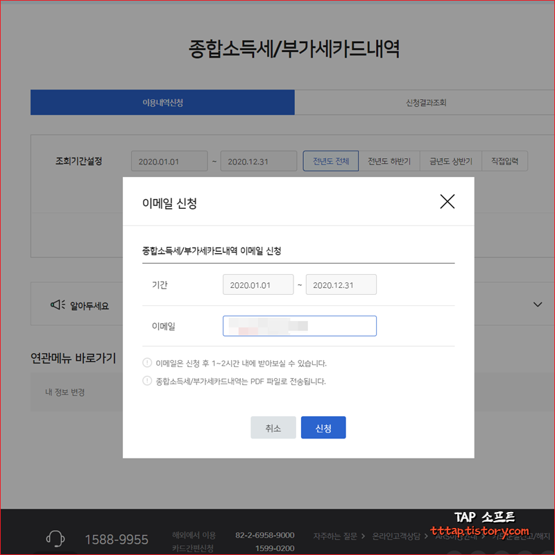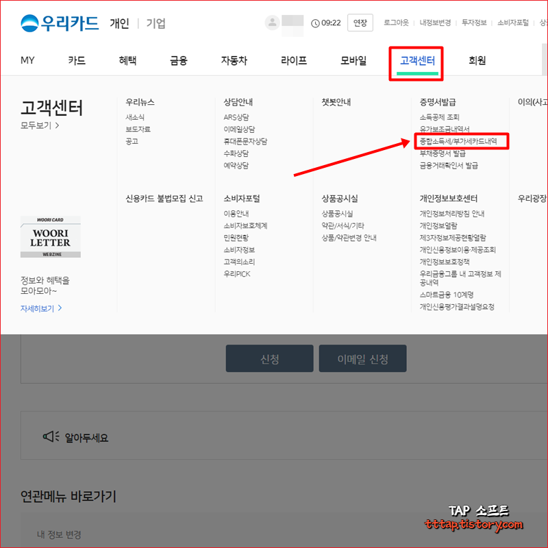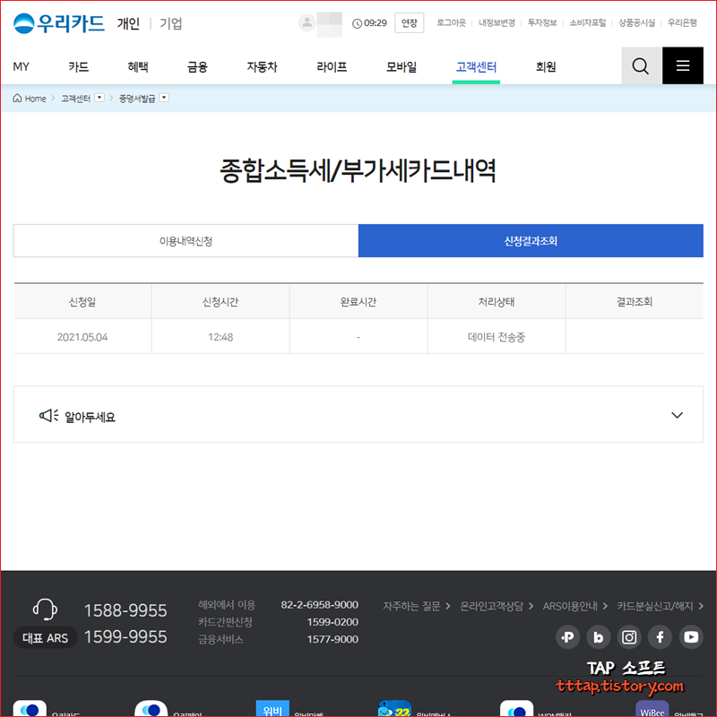 ▼ 1. 네비게이션 메뉴 중에서 고객센터 메뉴를 선택하고 하위메뉴에서 종합소득세/부가세카드내역 메뉴를 선택합니다.