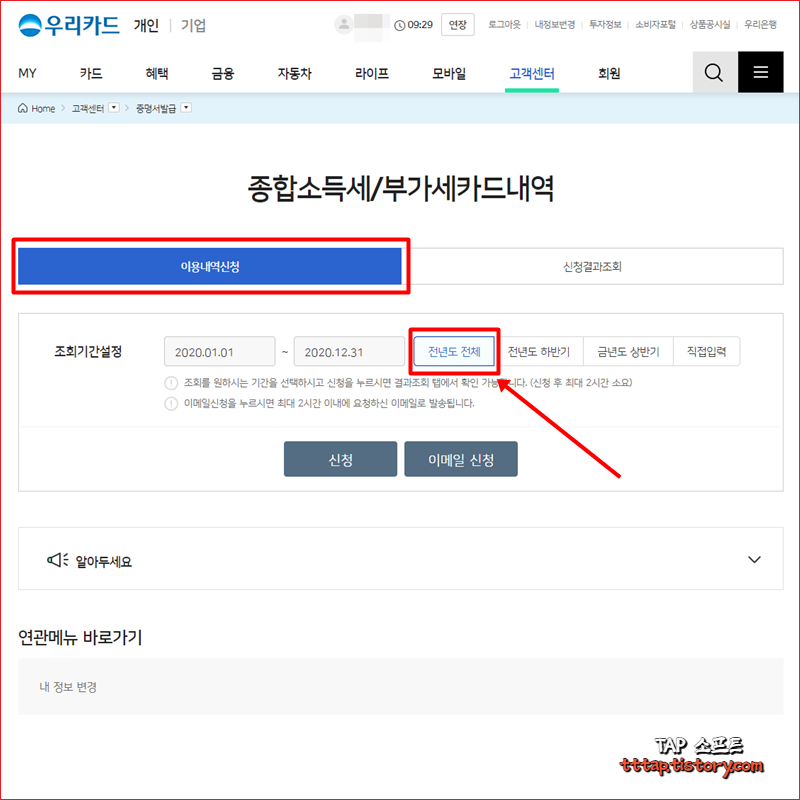 ▼ 2. 이용내역신청 탭에서 전년도 전체 탭을 선택하고 신청 또는 이메일 신청을 누릅니다.