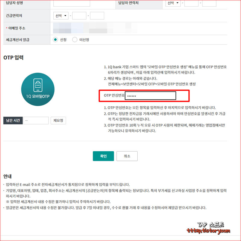 ▼ 8. 고객상세 정보 화면을 입력하고 아래쪽으로 스크롤해보면 OTP 인증화면을 볼 수 있습니다. 스마트폰용 하나은행 기업뱅킹앱을 다운로드해서 OTP 인증번호를 발급하고 입력해야 합니다.