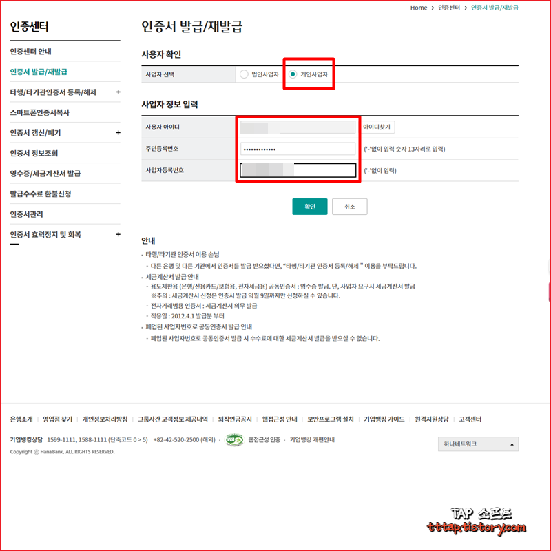 ▼ 2. 왼쪽 메뉴에서 인증서 발급/재발급 메뉴를 선택하고 개인사업자를 선택합니다. 그리고 다음 3가지 사업자 정보를 입력합니다.