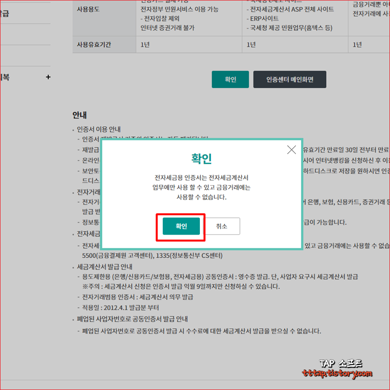 ▼ 4. 전자세금 인증서는 전자세금계산서 업무에만 사용할 수 있다는 확인창이 나옵니다. 그럼 확인을 눌러 다음으로 넘어갑니다.