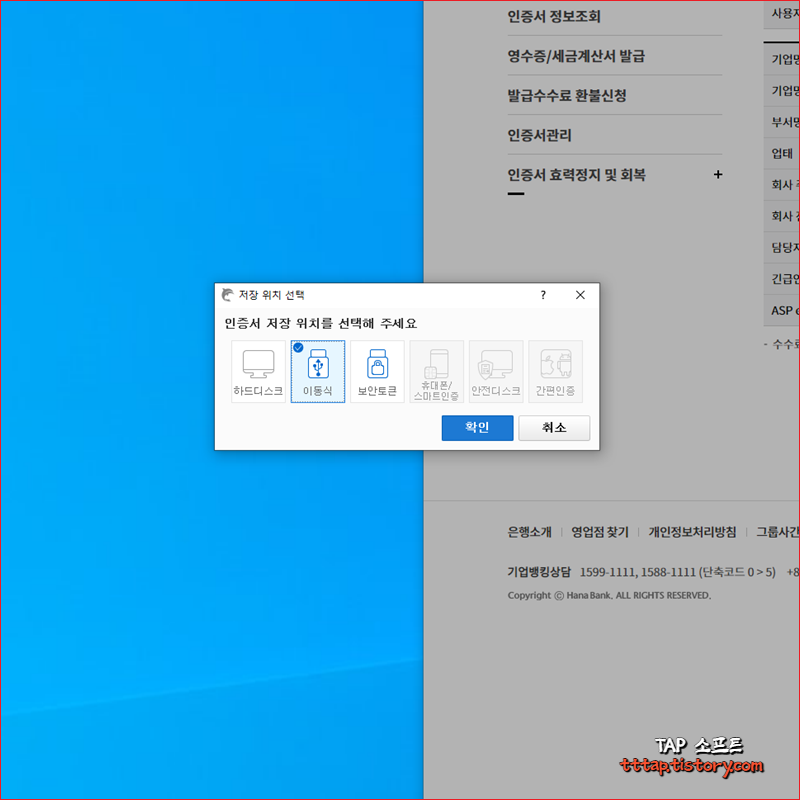 ▼ 11. OTP 인증까지 끝나면 저장 위치 선택에 대한 팝업이 노출됩니다. 저장할 곳을 선택하고 확인 버튼을 누릅니다. 보통 보안을 위해서 하드디스크보다는 이동식 디스크에 저장하고 사용한 뒤에는 컴퓨터에서 분리하는 것이 좋습니다.