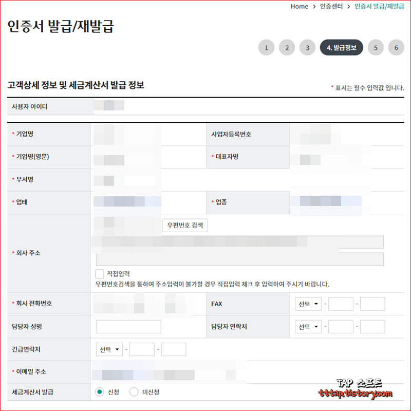 ▼ 7. 고객상세 정보 및 세금계산서 발급 정보에는 기업에 대한 상세정보를 입력합니다. 참고로 기업명이 공인인증서에 표시될 영문 이름입니다. 4,400원에 대한 세금계산서를 발급을 받기 위해서는 하단에 세금계산서 발급에 신청 버튼을 눌러줍니다.