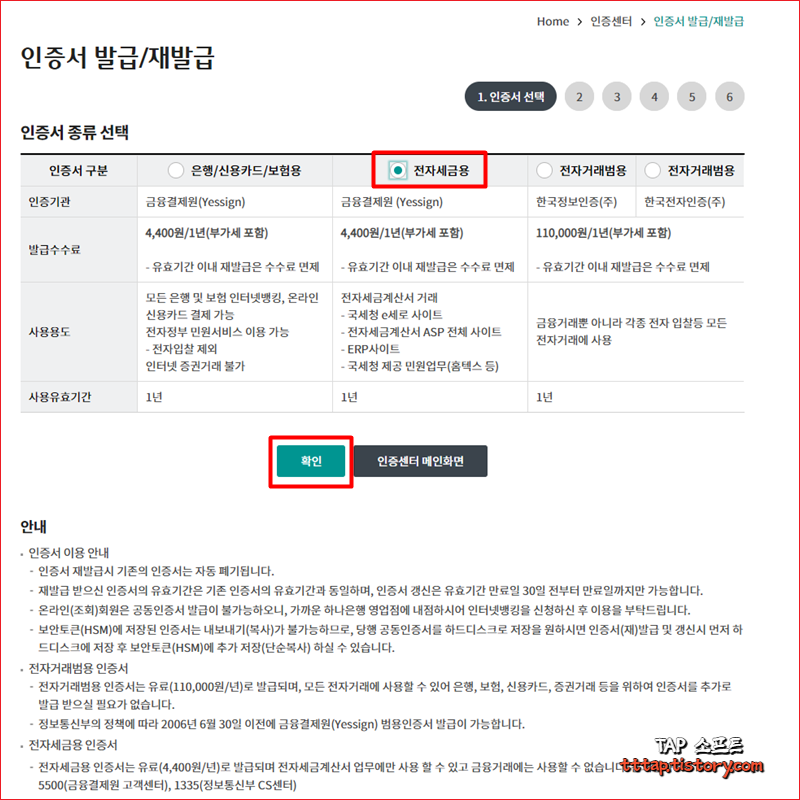 ▼ 3. 인증서 종류 선택 화면에서 전자세금용 인증서를 선택 후 확인 버튼을 누릅니다. 인증서는 다음 3가지 종류가 있습니다. 전자거래범용 인증서의 경우 두 개의 발급기관에서 발급하며 비용이 조금 비쌉니다. 11만 원이며 보통 법인인 경우 사용하는 것으로 알고 있습니다.