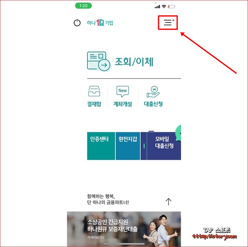 ▼ 9. 하나은행 기업용 앱을 설치하고 우측 상단의 메뉴버튼을 누르고 모바일 OTP 번호 생성 메뉴를 선택해서 번호를 발급합니다.